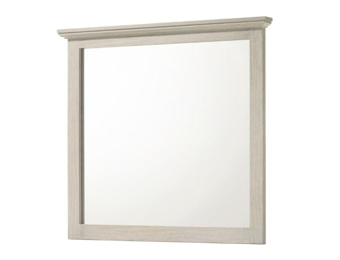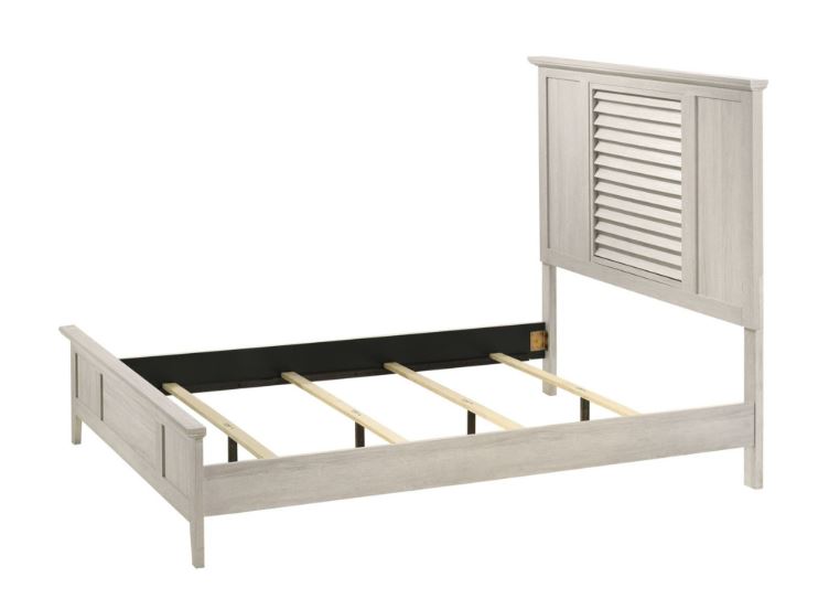 This bedroom collection radiates contemporary charm with its light wood finish and minimalist design. The bed, with its clean lines and louvered headboard, offers a modern twist on a classic design, creating a serene focal point in the room. Complementary pieces include a spacious dresser topped with a large mirror that adds depth and brightness to the space, a tall chest providing ample vertical storage, and a nightstand with convenient bedside access. Each piece is accented with sleek, dark hardware that stands out against the light finish, adding a subtle contrast that is both striking and elegant.