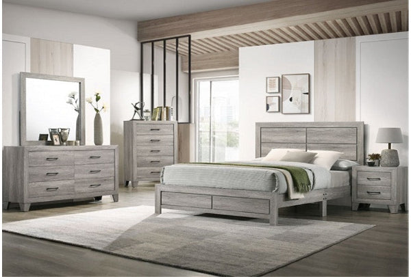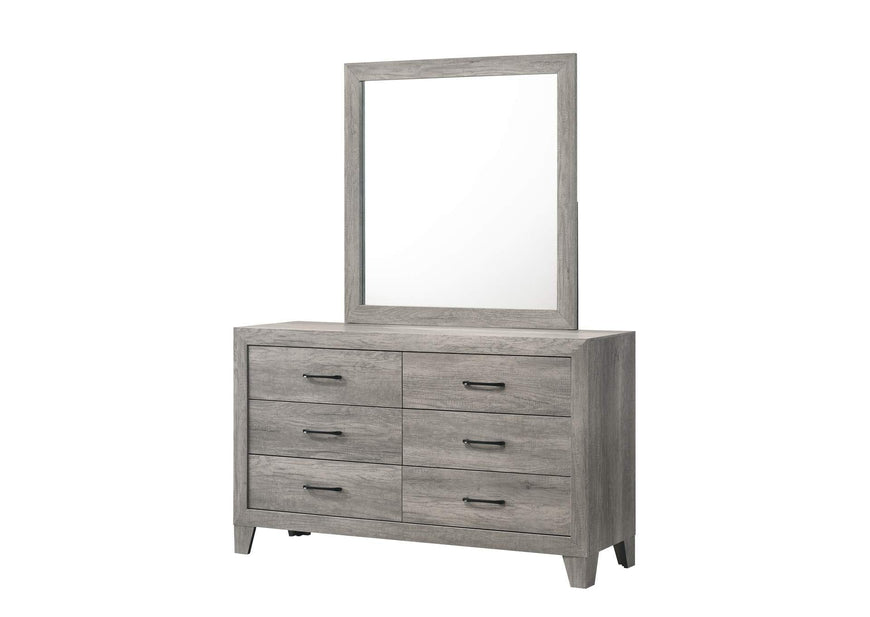 You’ll dream in style in the casual contemporary Hopkins platform bedroom set. A vibrant grey finish with clean lines adds to this stylish set along with the four-paneled headboard and platform base. Each piece in the set is made from hardwood veneers and solids yielding a durable construction. The case pieces have silver metal hand pull hardware which contrasts the grey finish perfectly. The dresser has six drawers and is paired with a rectangular landscape mirror. The nightstand has two drawers for additional bedside storage space.