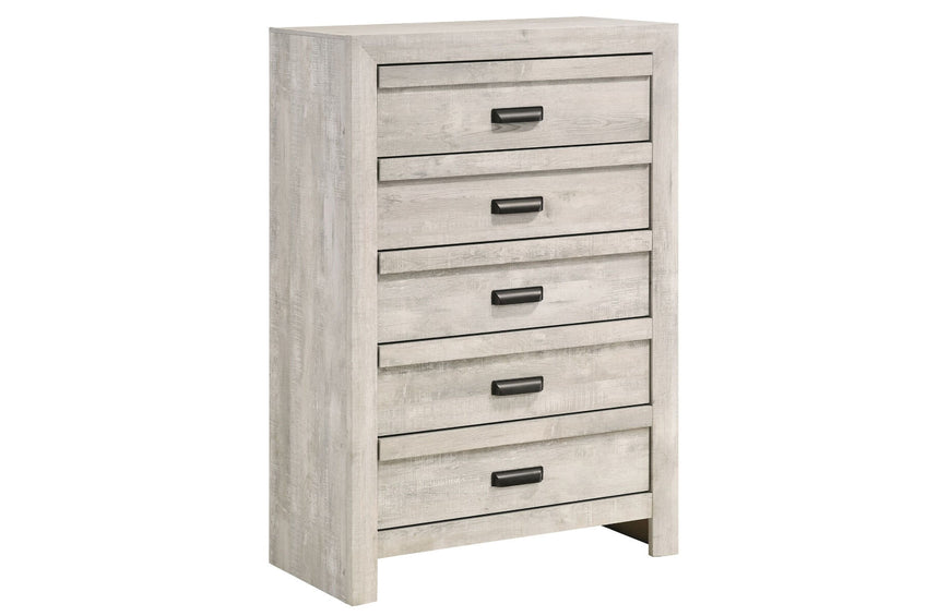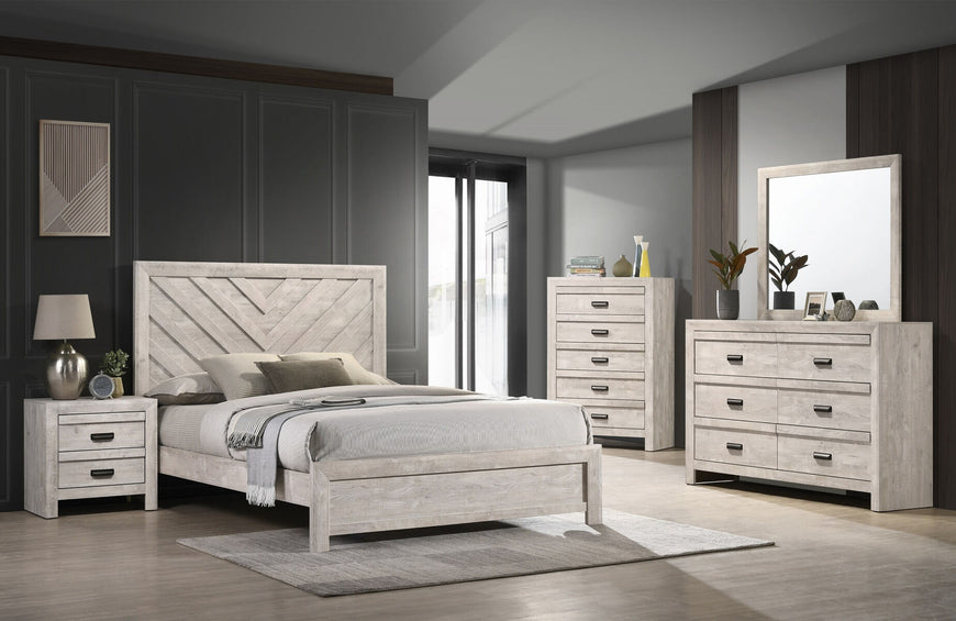 You’ll dream in style in the casual contemporary Petunia Panel bedroom set. A vibrant beige finish with clean lines adds to this stylish set along with a paneled headboard. Each piece in the set is made from hardwood veneers and solids yielding a durable construction. The case pieces have black/brown metal hand pull hardware which contrasts the beige finish perfectly. The dresser has six drawers and is paired with a rectangular landscape mirror. The nightstand has two drawers for additional bedside storage space.
