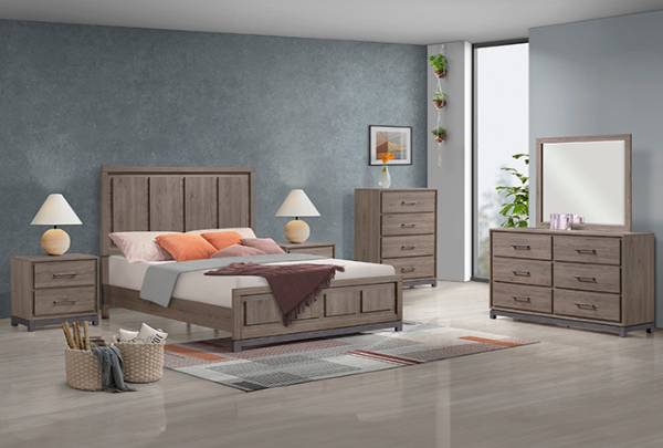 Discover the perfect blend of modern simplicity and understated elegance with this contemporary bedroom collection. Each piece, fashioned with a sleek, minimalist design and a soothing grey oak finish, offers a tranquil backdrop for your personal retreat. The collection is thoughtfully composed of a clean-lined bed frame, a streamlined dresser with ample storage, complemented by a large, practical mirror, and a nightstand that provides easy access to your nighttime essentials.