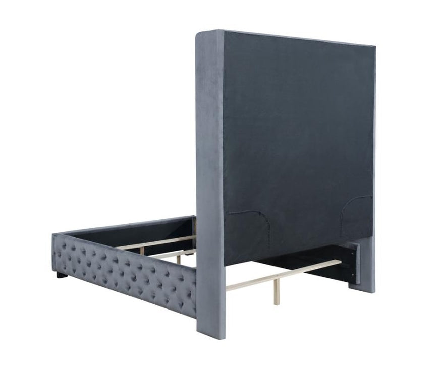 Create a stylish addition to your bedroom that's larger than life with this velvet upholstered bed. entirely wrapped in luxurious velvet, this panel bed is delightfully comfortable and glamorous. the headboard is constructed with vertical tufting that makes a modern impression in your sleeping space. this bed is supported on sturdy tapered legs that further enhances its appearance. crafted with durable and long-lasting pine wood.