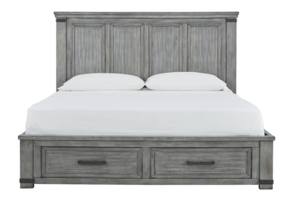 With its light weathered gray coloration, this storage bed conveys trend-right urban farmhouse style. Thick-profiled top moulding on the tall, mansion-scale headboard lends a fresh take on a timeless design. The footboard features two storage drawers with profiled frames and dovetail construction. Bar pulls and metal straps in a dark...