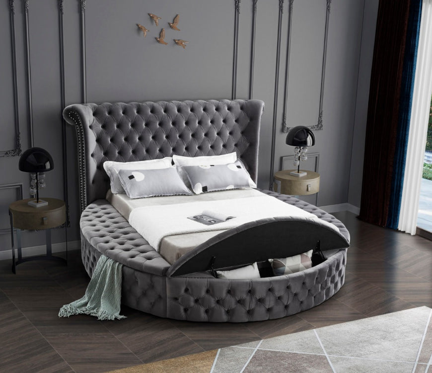 The imposing, regal headboard features rolled wingback styling complete with armrests that's both chic and comfortable. Both the headboard and footboard come with button tufted styling for added flair. The bed is upholstered in grey with metallic accents and nailhead trim. Usb plug ins on both side of the headboard make sure you stay connected at all times. This bed is a truly magnificent addition to the bedroom.