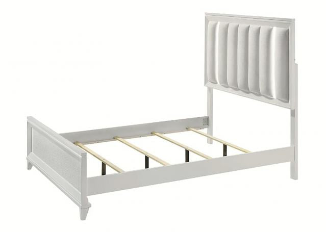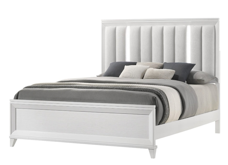 The Cressida will surely make a statement in your bedroom. It features tapered front feet, a low footboard, an upholstered cushion with LED lights on the headboard, and comes in a white finish.