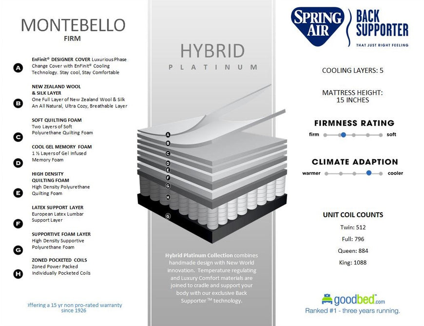 Cool. Supportive. Comfortable. Durable. The Montebello Firm Spring Air Mattress brings all the comfort and trusted quality of a Spring Air Back Supporter mattress. Cool-touch Luxurious Phase Change Cover with EnFinit Cooling Technology provides refreshing comfort and climate adaptability. Featuring a best-of-both-worlds hybrid construction, 1.5 layers of Gel-Infused Memory Foam pairs with two layers of Soft Polyurethane Quilting Foam to comfortably “hug” your body and promote less tossing and turning.