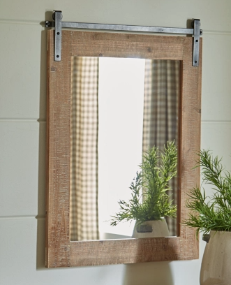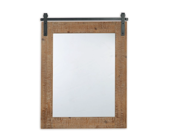 Getting the casual yet complete look you love is a breeze with this accent mirror. With its antiqued brown finished and rough sawn wood, this accent mirror features a black finished metal faux barn door track adding a touch of warmth to any space.