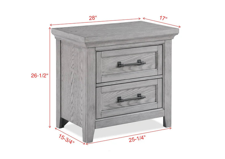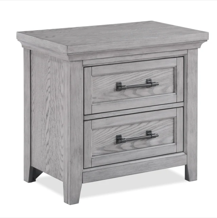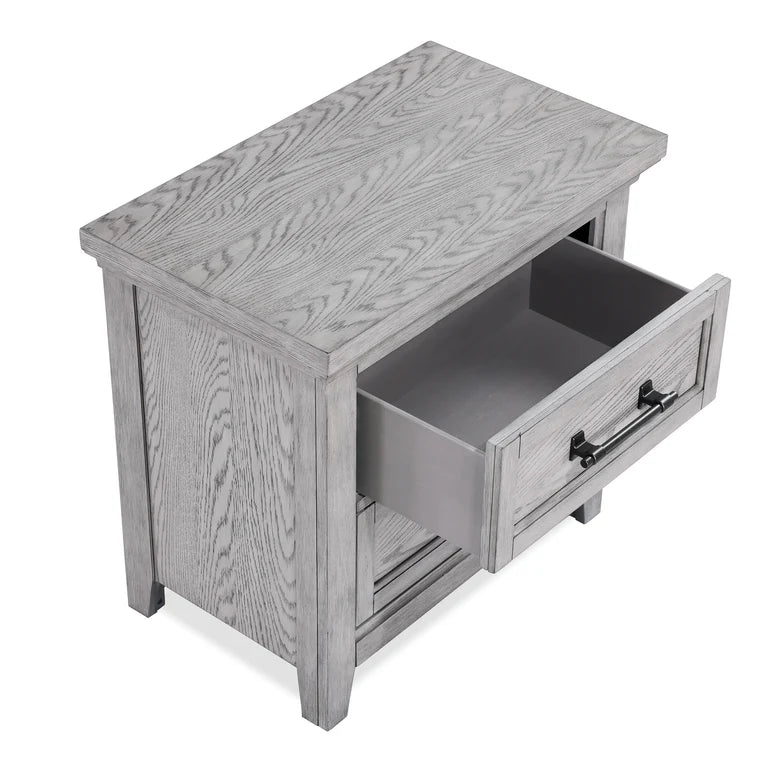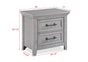 The matching nightstand completes the set with its cohesive design and weathered gray finish. Two drawers provide convenient bedside storage, with the top drawer slightly smaller for easy organization of personal items. The subtle, carved details and metal handles echo the dresser's design, while the sturdy top is perfect for keeping essential items within arm's reach throughout the night.
