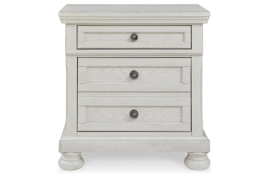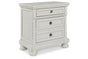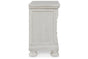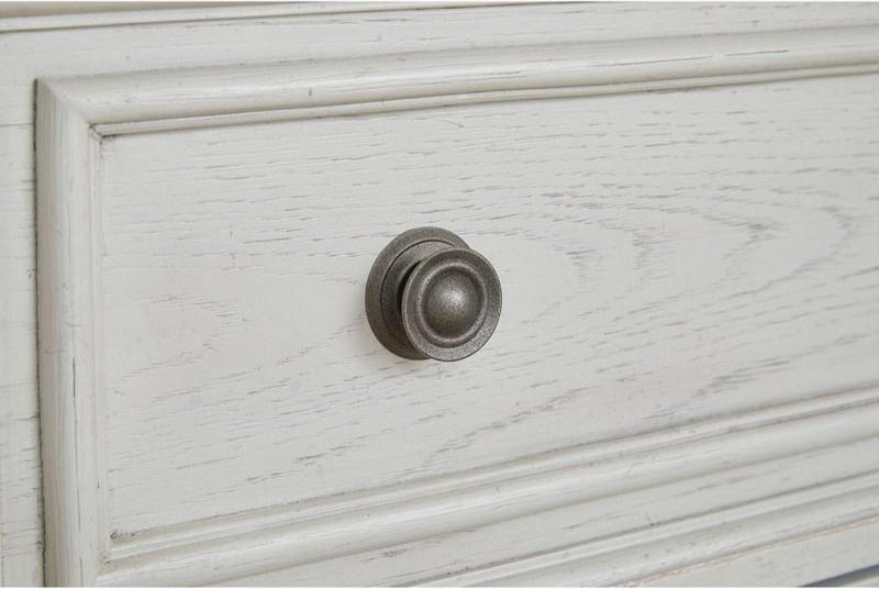 Elegant, timeless furnishings take your bedroom to the next level. Nothing does that better than this nightstand. The antiqued white finish with a wonderful grain texture radiates sophistication, while the dark bronze-tone hardware adds an ornate touch. A hidden pull-out tray behind the bottom drawer puts your small valuables out of sight. Felt finishing in the top drawer and a hidden pull-out tray rounds out the piece for the ultimate tasteful bedroom.