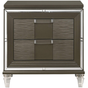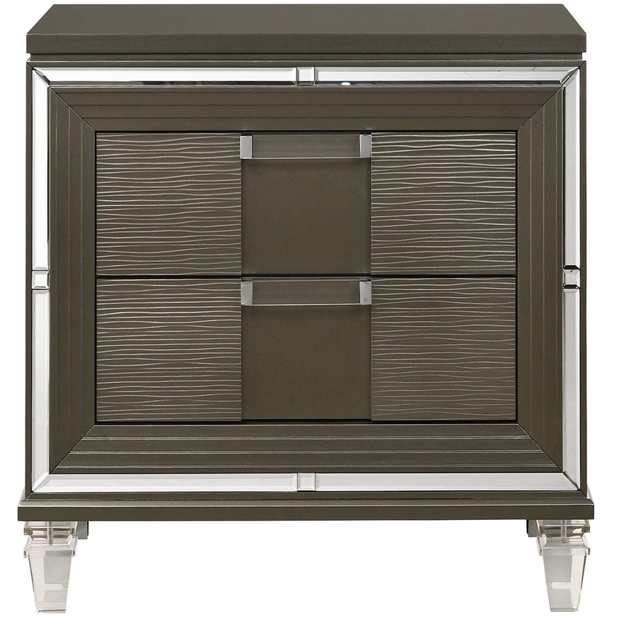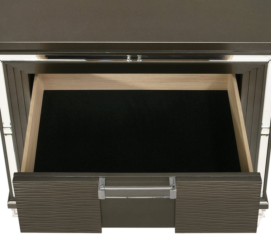 The sophisticated Fifth Avenue nightstand features a stunning finish paired with acrylic hardware and feet. The embossed detailing on the drawer fronts and felt lined top drawer make this nightstand a stunning addition to your master suite.