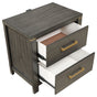 Complete a stylish, inviting bedroom with the refined look of a modern two-drawer nightstand. Its timeless stance showcases a soft gray wood grain finish, with brass toned accents and bar pulls that offer just the right touch of warmth. Its two drawers offer plenty of bedside storage for personal items and essentials, helping to keep your bedroom tidy and neat. The top drawer includes brown felt lining to protect delicate items or electronics, and a built-in USB port helps to keep your phone charged while lounging or overnight. Add a reading lamp to the top of the nightstand for a cozy, welcoming ambiance you'll love coming home to each night.