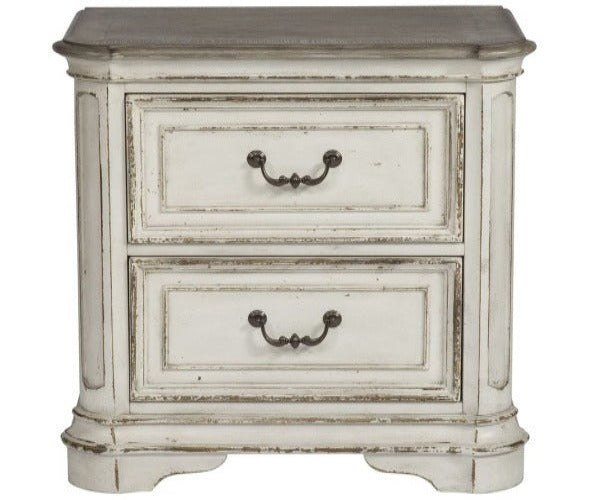 Elevating the art of traditional cottage styling, the Magnolia nightstand is your dream bedroom retreat realized. Antiqued two-tone aesthetic blends a chipped white with a distressed wood finished top for added charm. Framed drawer fronts and decorative corbels add refinement, while bail pulls in a dark bronze-tone finish lend a classic touch. Subtly placed USB/electrical outlets meld vintage inspiration with modern convenience.
