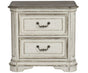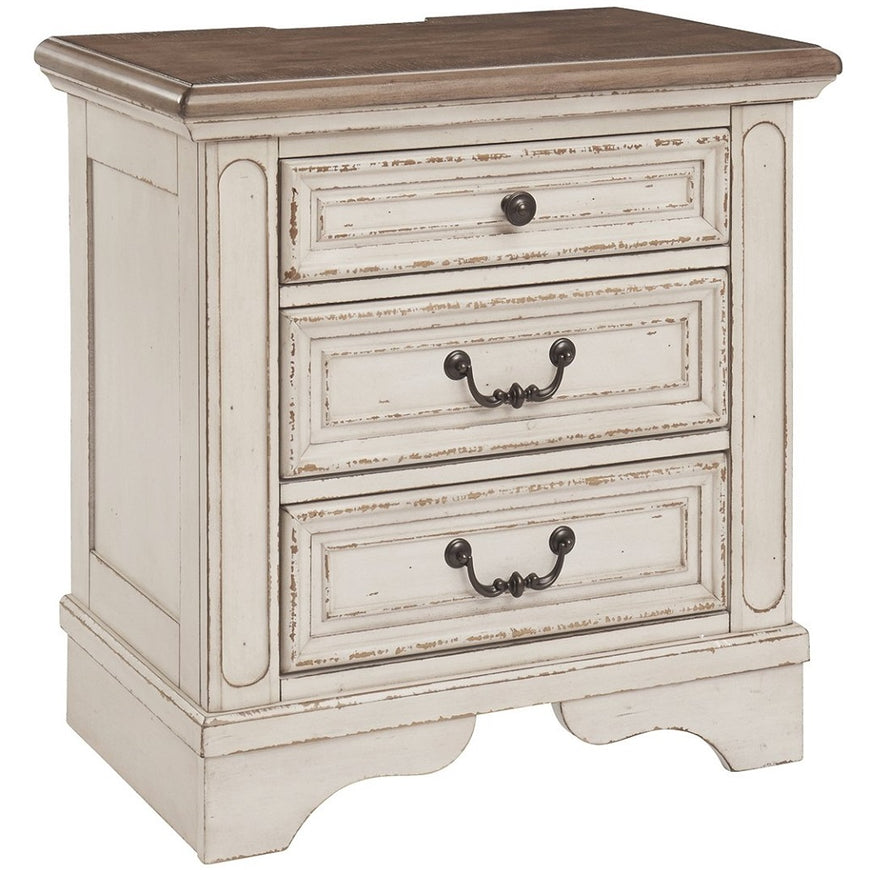 Elevating the art of traditional cottage styling, the Magnolia nightstand is your dream bedroom retreat realized. Antiqued two-tone aesthetic blends a chipped white with a distressed wood finished top for added charm. Framed drawer fronts and decorative corbels add refinement, while bail pulls in a dark bronze-tone finish lend a...
