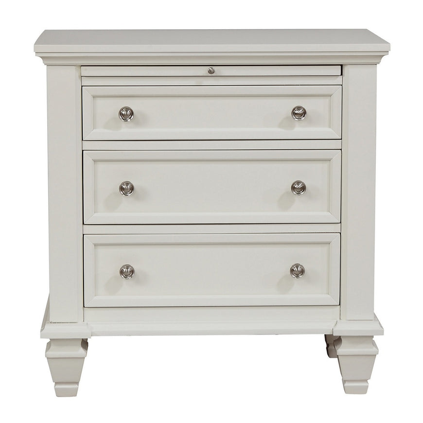 A clean shape defines this nightstand, with simple molding and square tapered feet. Three spacious drawers will help you hide clutter at your bedside, while allowing you to keep essentials close by. A pull out tray offers you additional surface area for snacks and beverages, making this a highly functional dresser.