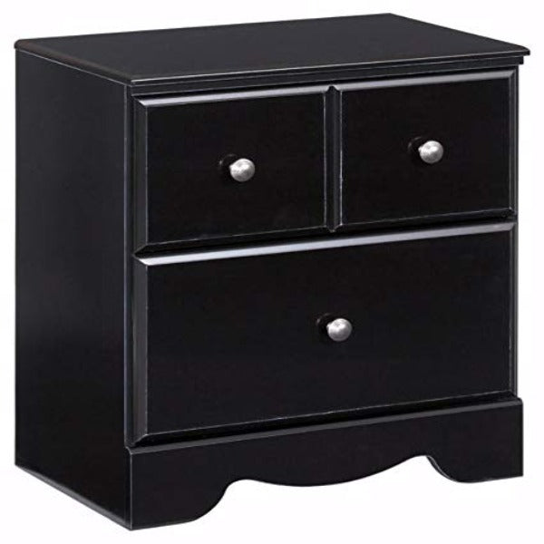 A dark finish and clean lines allow the Shay nightstand to fit with many types of decor. Though it’s classic contemporary, it’s also right at home among vintage furnishings. Two spacious drawers provide ample storage space. Snappy satin-nickel-tone knobs are a crisp complement.