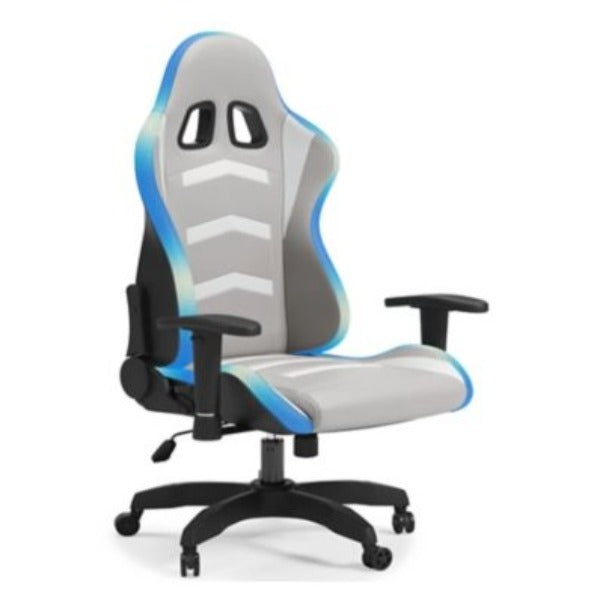 Tech this out: a swivel office chair that’s as cool as it is comfortable. The ultimate choice among gamers, this swivel office chair is hard to beat. Quality crafted with a sturdy steel frame, this swivel office chair with comfy contoured seat and cutting-edge design is upholstered in a durable faux leather in white and gray. Cleverly integrated into the chair: powered LED lighting to enhance the gaming experience. Choose from six different colors or stream a mix of color using the remote control. With a swivel base, smooth-gliding casters and adjustable seat height/tilt feature, this office chair with fully reclining backrest has serious game.