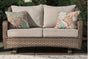 Clearly for those with exceptionally good taste, this outdoor loveseat glider revisits the past, but with today’s low-maintenance approach in mind. Modeled after classic “front porch” wicker furniture, this high-style two-seater includes a rust-free aluminum frame beautified with an all-weather resin weave for authentic flair—but with easy care! Covered in high-performing Nuvella® fabric, the loveseat’s plush cushions and throw pillows are sure to sit well with you, too.