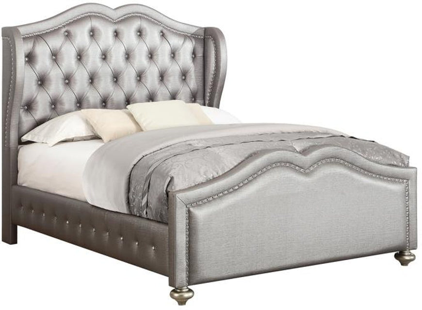 The Belmont features crystal button tufted headboard and rails. Individually applied chrome nailhead trim. Frame constructed with rubberwood and plywood. Solid rubberwood legs finished in metallic platinum.