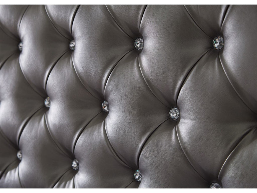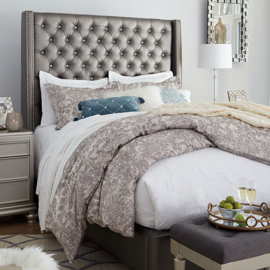 The Coralayne Bed allures with the glitz and glam befitting silver screen queens. Exquisite frame's metallic tone channels that Hollywood Regency flair you've been dreaming of. Tall upholstered bed with faux diamond tufting and gray textured cover. Also available in King Size.