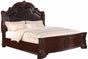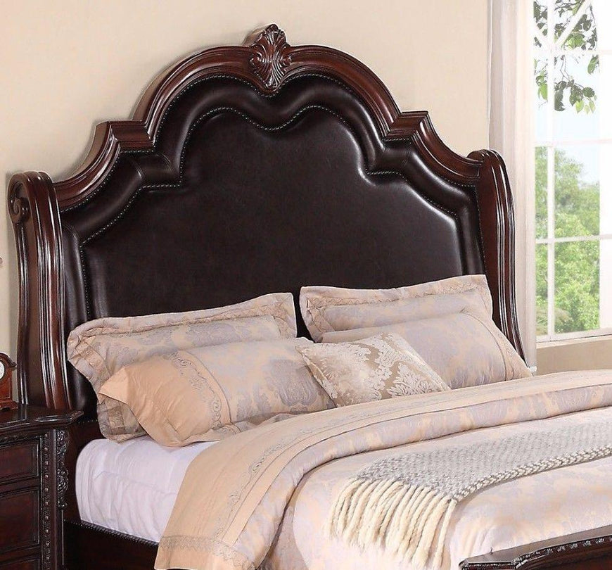 This bed features bracket feet, a leather-like upholstery headboard with nailhead trim, and intricately carved molding details that complete the look of the bed. Transform your master bedroom suite to one of luxury with this traditional style panel bed. It has upholstered headboard panels, stout, bracket legs, and matching side rails....