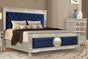 This contemporary Upholstered Panel Bed features a padded rectangular headboard and low profile footboard in luxurious dark upholstery with elegantly tapered legs. Crafted with a transitional look that is an ideal addition to any bedroom, the headboard and footboard is accented with button tufting, raised geometric patterns and mirror finish....