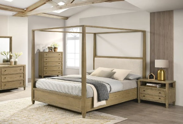 The Sienna collection sounds like a beautiful fusion of modern design and rustic allure! With its canopy bed available in both king and queen sizes, it offers a grand centerpiece for the bedroom, exuding elegance and comfort. And it's fantastic that the collection provides everything one might need for both comfort and storage. That combination of style and functionality ensures that the bedroom becomes a truly inviting and functional space. It sounds like a perfect blend of contemporary sophistication and timeless charm.