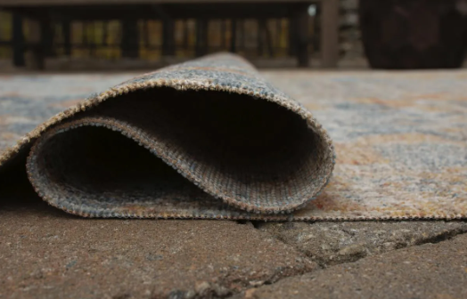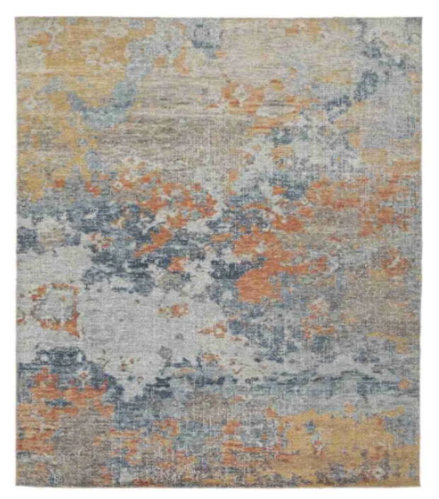 With its striking abstract pattern, this indoor/outdoor area rug leaves so much to the imagination. Its ethereal design—in shades of blue and hues of ivory, taupe, mustard and burnt orange—dresses up a room with brilliant color, visual texture and a highly contemporary point of view.