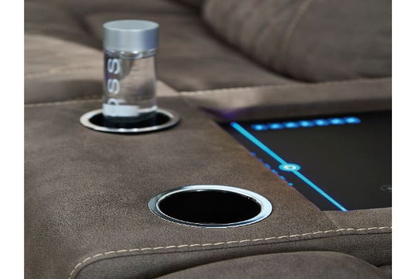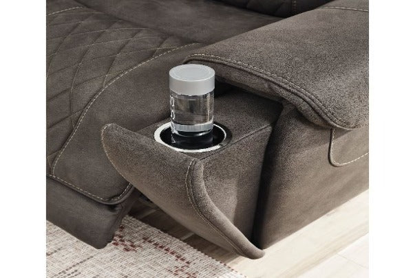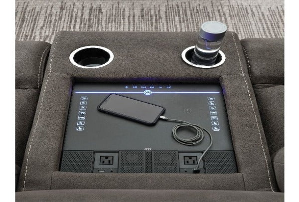 Stylish in design and function, this power reclining sectional with console creates a comfortable place to gather with family and friends. The sectional, upholstered in heavyweight faux leather with quilting and jumbo stitching, invites you to sink into plush opulence at an affordable price. The zero-wall power reclining mechanism features infinite positions for comfort. Conveniently plug in your devices to the USB charging station. Appealing to those with an eye for sumptuous design and high-tech features, this gunmetal gray sectional will always be a win.