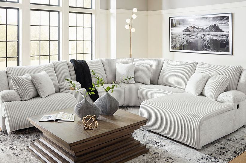 Experience unparalleled comfort with this reclining sectional with a chaise. It’s a stylish and invitingly soft look—made all the more appealing by cozy corduroy cushions that feel great and add a touch of texture. The neutral hue effortlessly blends into your decor, making it a gorgeous addition to your home. So sit back and unwind in this spacious set, perfect for gatherings with friends and family.
