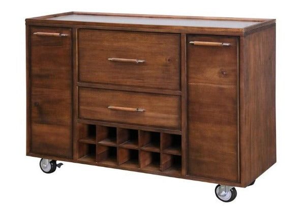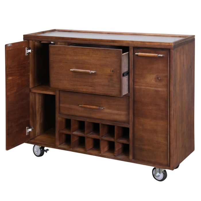 Mobile bar with metal top work surface. 2 drawers with metal glides. 2 doors with Euro hinges.