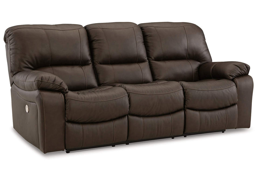 This practical power reclining sofa emphasizes functionality, combining contemporary character with irresistible comfort. Its affordable, leather upholstery ensures a stylish look without breaking the bank. With the convenience of reclining at the touch of a button, this piece is perfect for relaxed, luxurious seating areas designed for quality time.