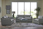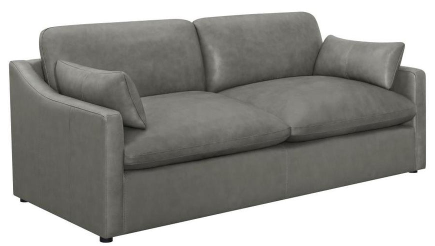 Upholstered in a grey top grain leather, this sofa seating set can truly lend itself to the color palette of your choosing. Thin sloped track arms with stitch detailing, along with deep pillow-like seating invite you to sit back and relax. In addition, each cushion and seat is filled with premium eco-friendly down alternative, making them the perfect addition to a green home and lifestyle. Matching side kidney pillows offer extra comfort. Constructed of solid wood frames, each piece is made to last for many years and offers a stable, durable build.