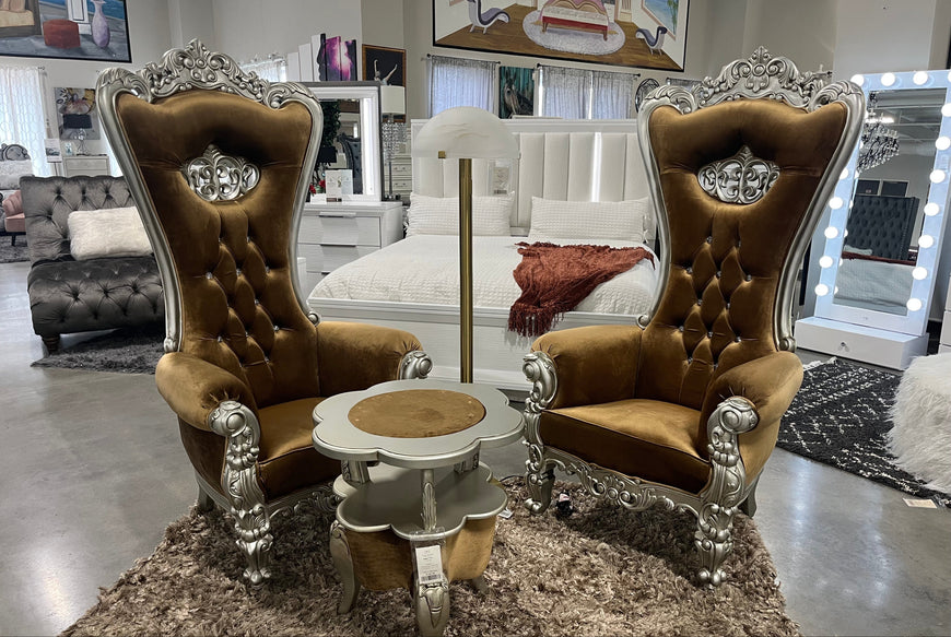 Luxurious throne-style chairs with a regal design. The chairs have a high, curved backrest upholstered in plush brown velvet with deep button tufting, adding to their opulent appearance. The frames are ornately carved with intricate detailing and finished in a rich gold color, enhancing their royal aesthetic. A decorative gold crown emblem is embedded in the upper center of each backrest, reinforcing the majestic theme. The armrests and legs of the chairs are also elaborately carved with elegant scrollwork. One throne sold per purchase.