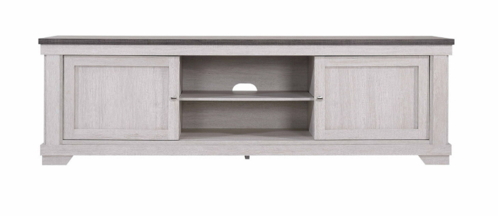This entertainment console blends rustic charm with modern functionality, perfect for organizing your media setup in style. Its light, weathered wood finish and contrasting dark tabletop provide a striking balance of warmth and elegance. Sliding doors provide both open and hidden storage options for decor and electronics. The built-in cable management system ensures a clean, clutter-free look, while the sturdy design ensures lasting durability. Ideal for a variety of decor styles, this console is a chic and practical addition to any living space.