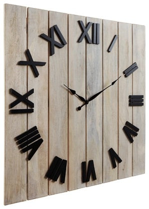 Keep your household on time with this wall clock. The whitewashed panels and black Roman numerals make a modern impression when added to any farmhouse decor.