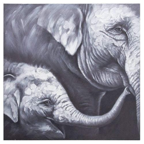 Ultimate Love features a 100% hand painted illustration of an elephant mother and calf on wrapped canvas. The calming, neutral hues of grey and blue perfectly accentuate a bedroom or living area with a modest colors and decor. Despite the picture's neutral colors, the raw devotion and affection depicted is able to transform any atmosphere.