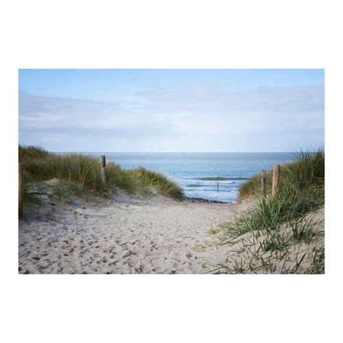 Enjoy seaside bliss in your home or office with this gorgeous metal wall art. In this painting, soft white sand and tufts of green grass overlook the vast, serene ocean. The scene depicts a pleasant day with blue sky and some wispy clouds. This image will bring immediate calm to whoever sees it, and it will beautifully complement your living space.