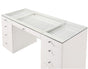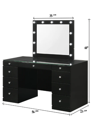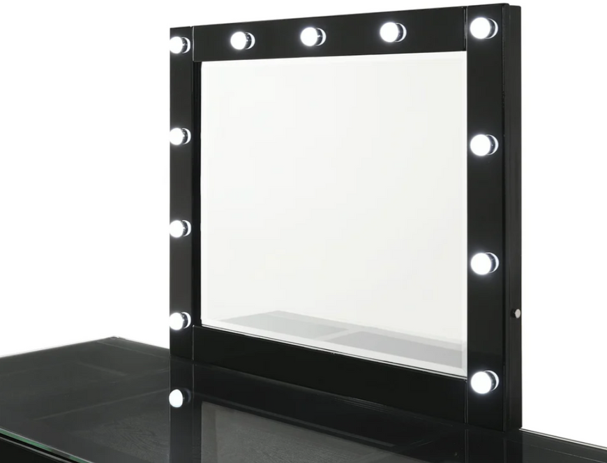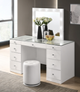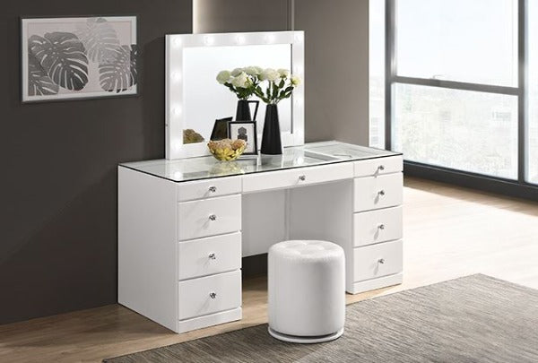 Step into a world of glamour with this sleek and chic vanity set, a perfect fusion of functionality and fashion. Its glossy white finish and clean lines are complemented by the sparkle of crystal-like knobs, adding a touch of sophistication to your personal space. The spacious tabletop, graced with a large mirror surrounded by radiant lights, offers an ideal stage for beauty routines, ensuring flawless makeup application under impeccable lighting. With a variety of drawers, this vanity provides ample storage to keep essentials organized and within reach. The included stool with its luxurious upholstery provides a comfortable seat that rounds out this vanity set, making it a must-have for those who appreciate a touch of luxury in their daily life.