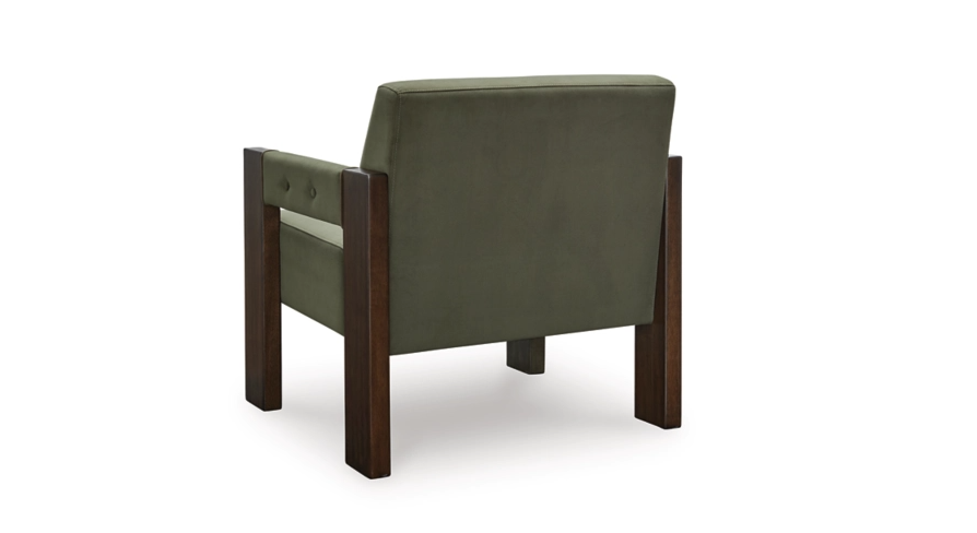 Get your modern sophistication on with this chic accent chair. Its rich olive green velvet upholstery is both luxurious and inviting, while an espresso-finished wood frame provides a warm, grounding element. The chair's clean lines and minimalist design make it a versatile piece that complements a variety of decor styles.
