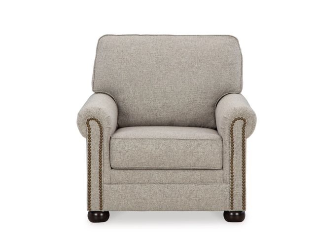 Inspired by the past but rooted firmly in the present, this chair complements your transitional seating area. Its versatile upholstery is delightfully detailed for a subtle herringbone effect. Designer touches like decorative nailhead trim and bun legs add traditional character. With this chair’s reliable style and comfort, all you need to do is sit back and relax.