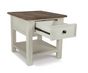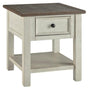 Whether your style is farmhouse fresh, shabby chic or country cottage, you’ll find the Bolanburg end table dressed to impress. Its two-tone, gently distressed finish pairs weathered oak with antique white for that much more quaint character. Charming elements include a plank-and-frame style top, black faceted hardware and a smooth-gliding drawer for remote controls and more.