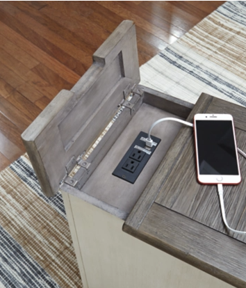 - Lift-top back revealing 2 electrical outlets and 2 USB charging stations
