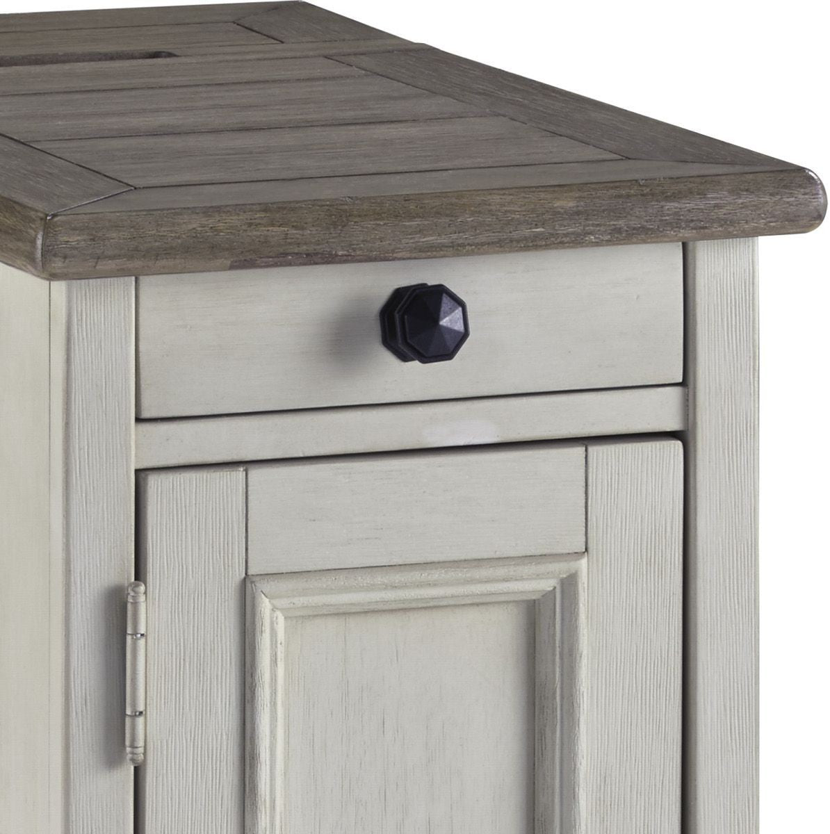 Display and contain your favorite things with the Bolanburg Chair Side Table. Its textured antique white finish creates a vintage two-tone look, while outlets and USB ports provide functionality. This is a piece you will enjoy for years to come. Pull-out tray Minor assembly required Two-tone antiqued finish Lift-top back...