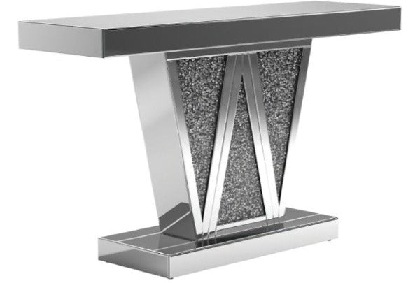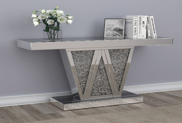 Heighten the glamour in your contemporary space with this console table. This contemporary console table boasts a shiny silver finish for a lux feel. The linear design gives a geometric silhouette with sculptural appeal. The rectangular body features a textured effect that is enhanced when light shines upon it. Add this contemporary glam to any room for an instant lux atmosphere