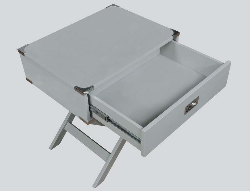 The Hudson chairside table comes in a grey finish and features hardware accents on the corners and an X-style base with stretches. The drawer provides extra storage space for your books or small electronics.