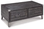 Mixed material lift top table truly elevates rustic-industrial style. Weather-washed pine wood and veneers are contrasted with canted metal legs and corner bracket accents for a uniquely chic merger of earthy beauty and contemporary flair. A handy spring-loaded mechanism brings the tabletop to you, while two drawers with removable storage...