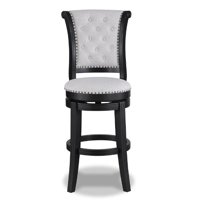 The Granville Swivel stool is beautifully crafted. With a button tufted full height back, nail head trim detail, and cushioned upholstered seat, it provides a classic look that adds a touch of sophistication to your space. Upholstered in a soft dove gray upholstery makes this a versatile piece for a variety of decor styles. A 180 degree swivel and wood footrest offer accessibility and comfort. Full assembly required.