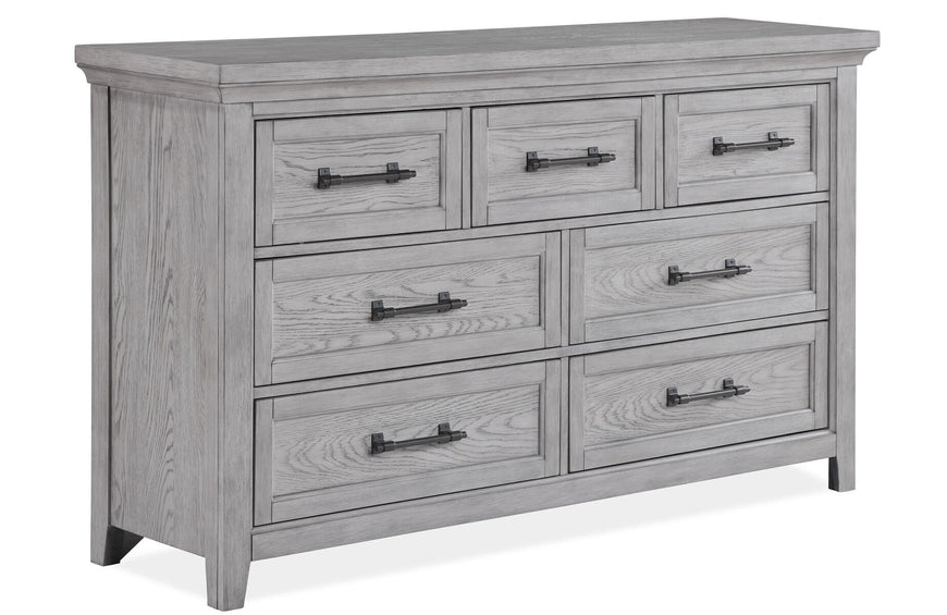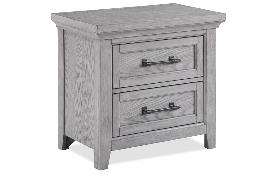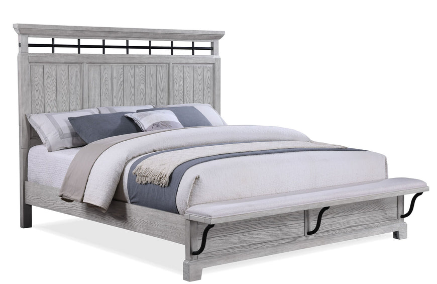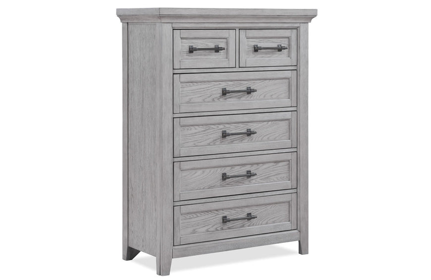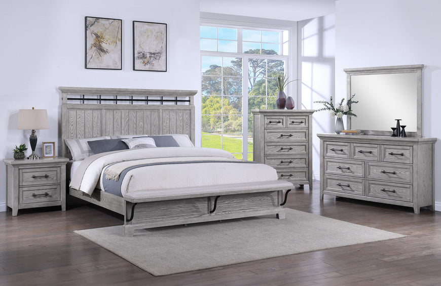 This bedroom suite offers a refreshing take on rustic charm, featuring a soft finish that highlights the natural wood grain. The sturdy bed stands as the centerpiece with its robust headboard and inviting design, while the accompanying pieces — a nightstand, dresser, and chest — provide ample storage, each fitted with understated hardware that accentuates the collection's country-inspired look.