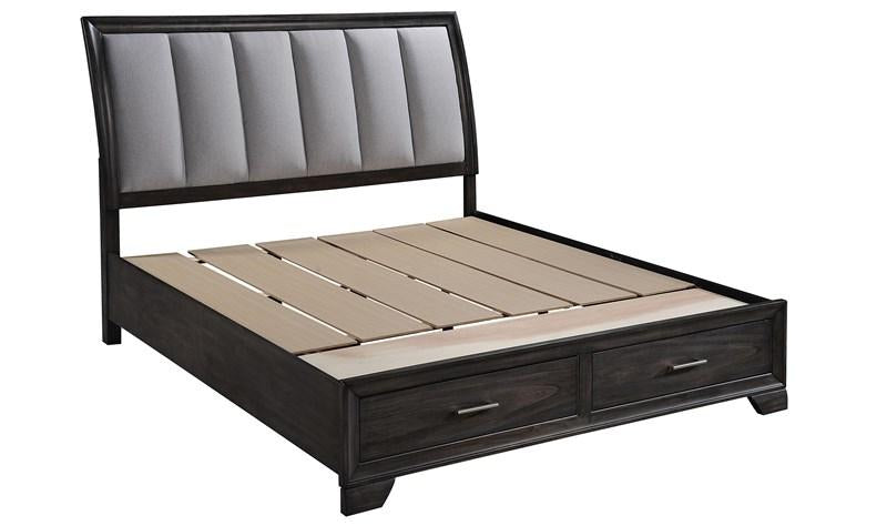 This handsome collection of bedroom furniture will create a bold, contemporary atmosphere in your room. The finish is dark yet vibrant and pairs well with the clean and straight-angled case designs. The highlight of the collection is surely the ultra plush upholstered headboard, which adds some comfort and warmth. Keep your bedroom organized and maximize precious space with footboard storage drawers. Conveniently located under the sleeping surface in lieu of a boxspring, these drawers are perfect for keeping clothes and other bedroom items stored and organized.