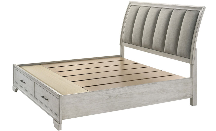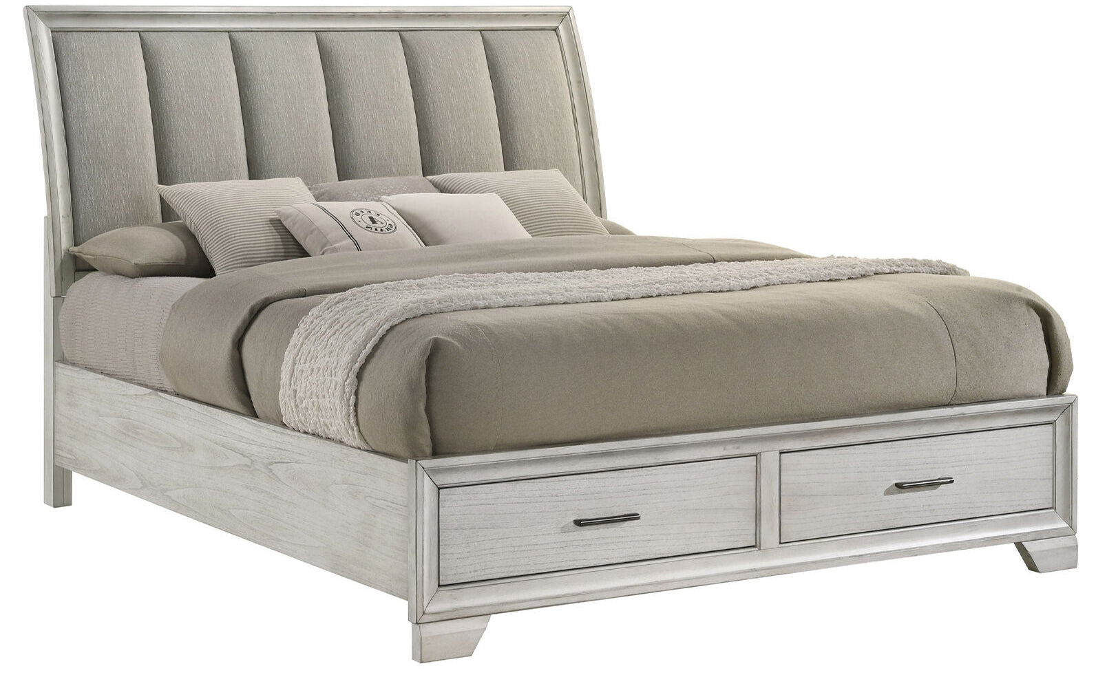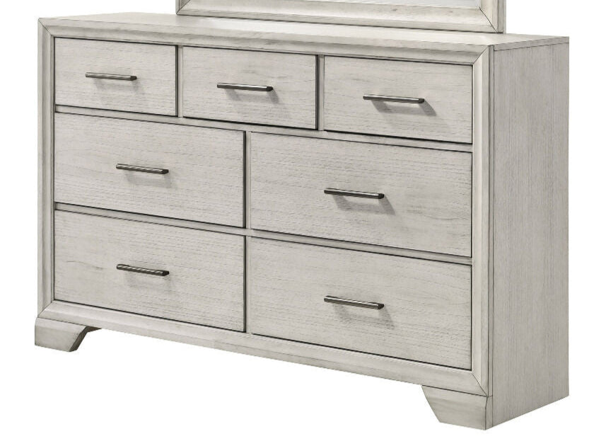 This bedroom set offers a sleek and stylish update to any space, featuring a white mist finish that commands attention while maintaining a sense of warmth and coziness. The bed stands as the stunning centerpiece, with its high, padded headboard upholstered in a plush fabric that invites relaxation and comfort. Flanking the bed are matching nightstands, providing convenient access to storage and display space. The set is rounded out with a spacious dresser, accented with a broad mirror that adds depth and brightness to the room. This set includes headboard, footboard, rails, dresser, mirror, and nightstand.