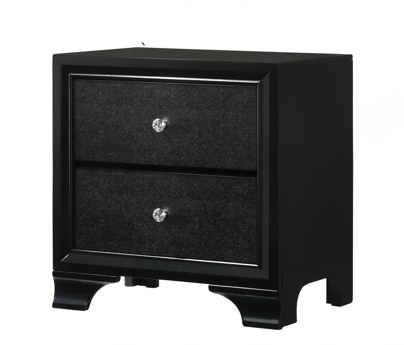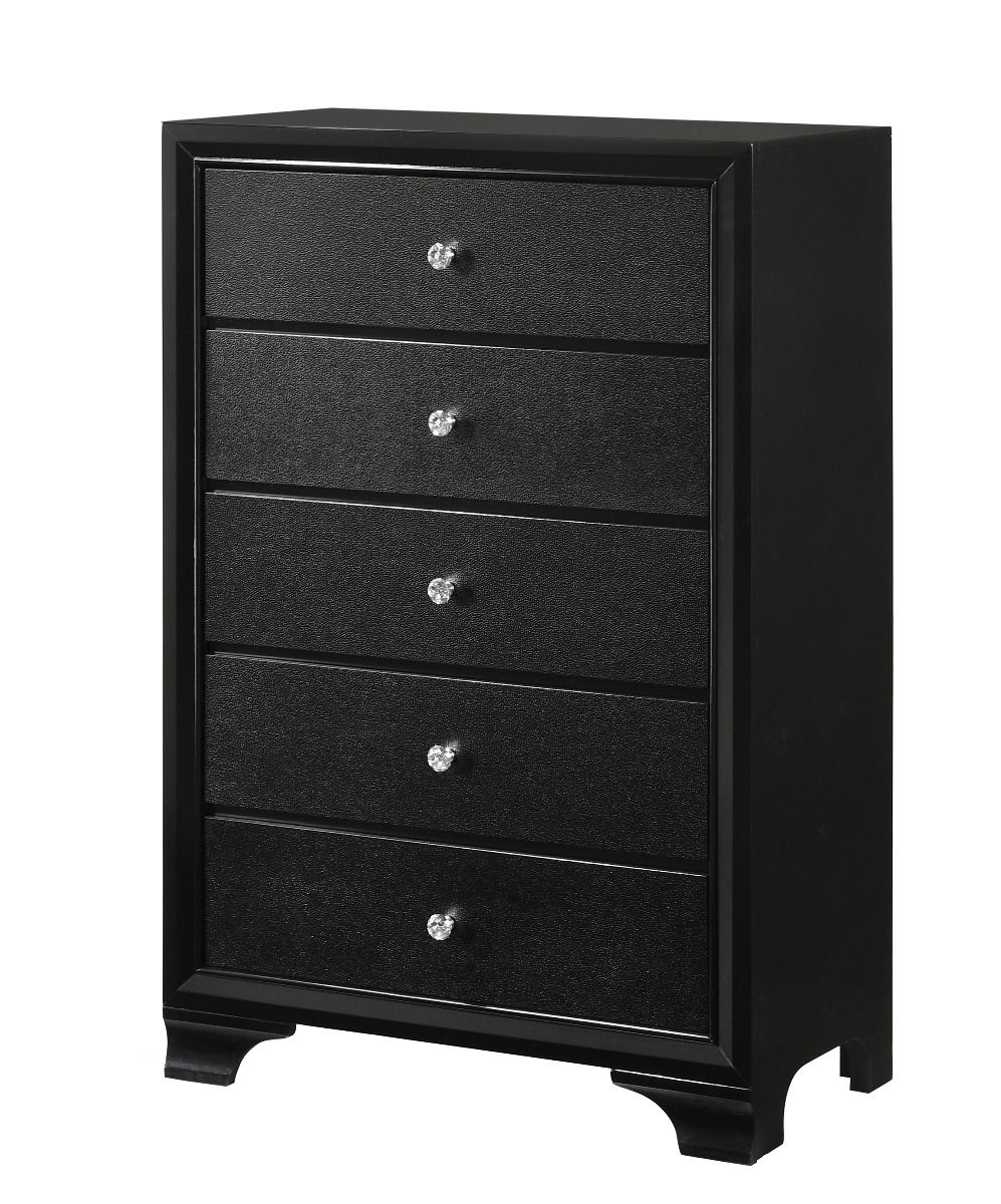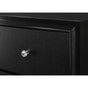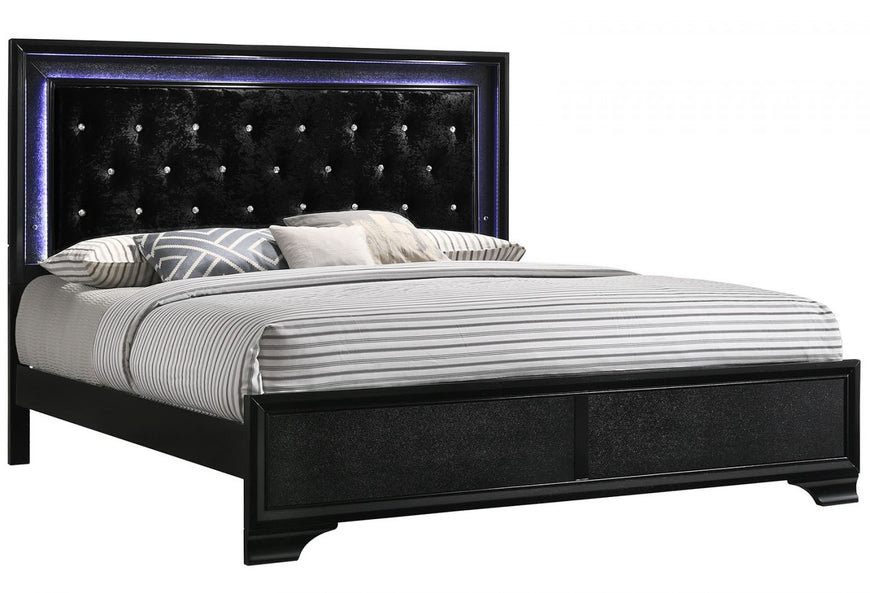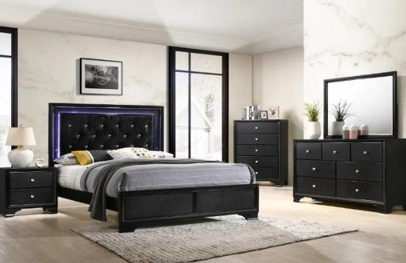 Introduce a bold touch of glam into your space with this gorgeous black finished bedroom collection. The LED backlit bed is perfect for the daring types with its velvety upholstered headboard and chic crystal button tufting. The footboard and drawer fronts are adorned with textured panels, adding to the striking look. With crystal-like drawer pulls, dark color and sleek lines, this bedroom collection will create an impressive dark glam feel in your bedroom.